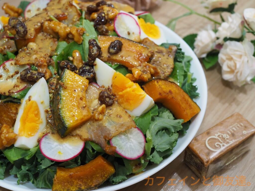 白ワインビネガードレッシング、キャラメルソース、粒マスタード、くるみ、レーズン、塩こうじ漬けベーコンなどが入っています。