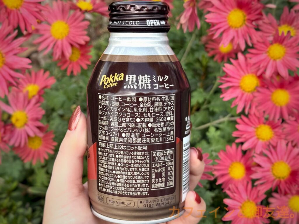 牛乳(国内製造)、砂糖、コーヒー、全粉乳、黒糖、デキストリン/カゼインNa、乳化剤、甘味料(アセスルファムK、スクラロース)、セルロース、香料、(一部に乳成分を含む)